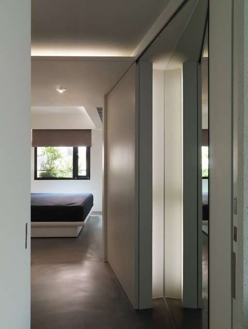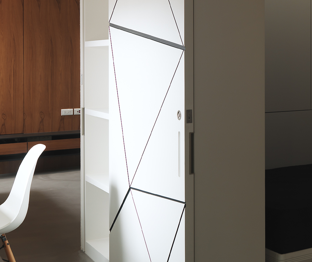 運用線條雕塑空間 利用優美弧線引導行進動向 自入口玄關處伸展的弧牆 轉折出隧道般的神秘感 一致性的木質天然紋路 模糊了廁所、廚區門片的開口線條 完整空間整體氛圍